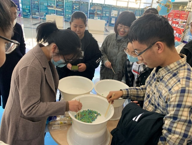“夹玻璃珠”比赛中,两组对手进行着比拼。比赛正式开始,同学们又紧张又着急,只见有的同学动作又快又稳,有的同学动作略显缓慢,还有的同学把珠子都抖出去了——真可谓“一颗玻璃珠难倒英雄汉“。