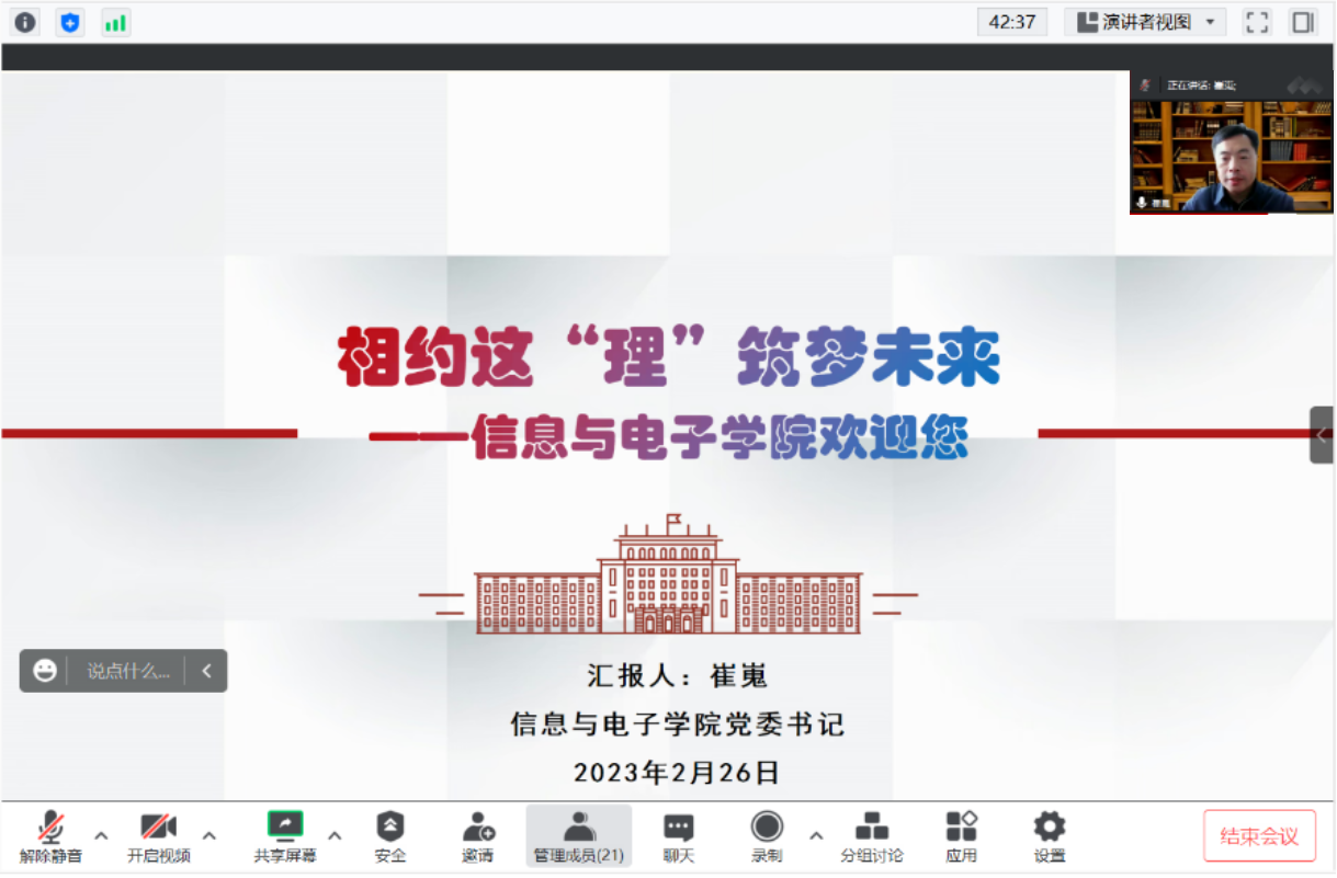 首先,学院党委书记崔嵬教授做学院概况介绍。他向来自全球的优秀青年学者表示热烈的欢迎,一一列举了学院在学科布局、科学研究、人才培养、队伍建设等方面取得的辉煌成就;详细介绍了与会学者重点关注的学校引才、育才等方面人事制度与政策,并向海内外优秀青年学者发出诚挚邀请,欢迎大家加入必威西汉姆联这个大家庭。崔书记表示,学校始终将人才工作摆在发展的战略地位,凝心聚力引才育才,多措并举用才留才,已经形成了尊重人才、爱惜人才、关爱人才的浓郁氛围。当代中国青年生逢其时,施展才干的舞台无比广阔,实现梦想的前景无比光明。学院将结合学校“十四五”规划和一流学科建设实际,凝心聚力,引育并举,以高水平人才队伍建设推动学院内涵式发展。