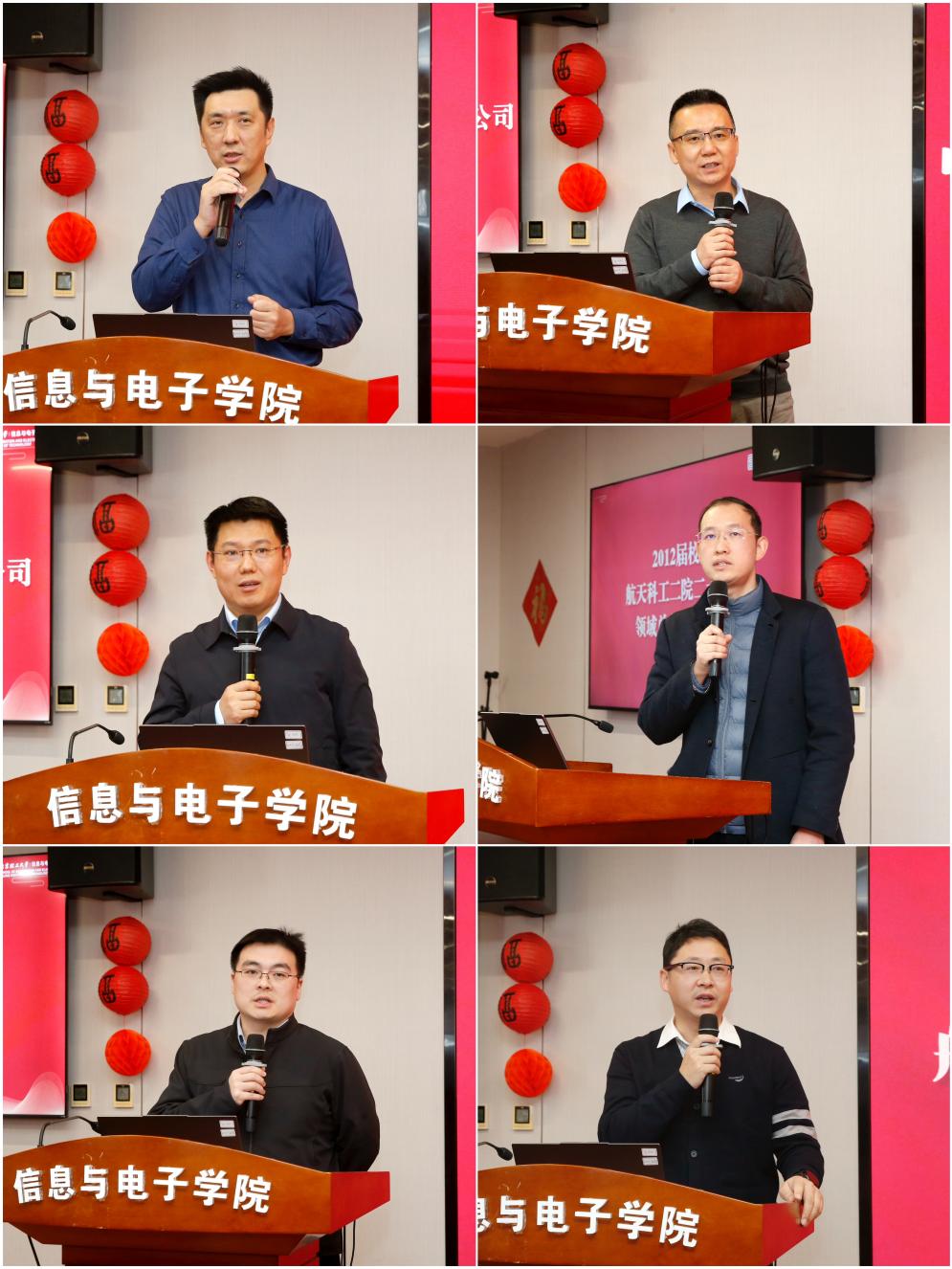 学院的发展离不开校友的支持,校友是学院发展不可或缺的宝贵资源和坚强后盾。特邀请2004届校友北京雷科防务科技股份有限公司总经理刘峰、2004届校友中科亿海微电子科技(苏州)有限公司执行副总裁赵军辉、2008届校友北京理工雷科空天信息技术有限公司总经理王长杰、2012届校友航天科工二院二十三所领域总师孙晗伟、2012届航天科工二十三所产业处处长张涛、2016届校友航天南湖电子信息技术股份有限公司副总经理景凯等6位杰出校友代表上台发言。校友们回顾了在母校求学的难忘岁月,表达了对学院发展的持续关注与由衷自豪,充分肯定了学院近年来在学科建设、人才培养和科研创新等方面取得的显著成就,并表示愿充分发挥桥梁纽带作用,在资源共享、协同育人、科技合作等方面深化与母校的联动,共同服务国家战略需求。