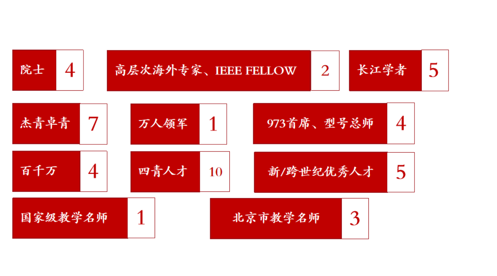 学院现有教职工245人,师资队伍汇聚了40余人次国家级高层次人才、教学名师以及8个国家/省部级创新团队。其中包括:王越、毛二可、张军、龙腾4名全职院士、2名IEEE fellow、13人次国家高层次人才项目专家、4名百千万人才工程国家级人选、2名国防科技卓越青年人才基金获得者、10位国家高层次青年人才、5位新/跨世纪优秀人才、1名国家级教学名师、3名北京市教学名师。此外,拥有2个国家级教学团队、1个国家自然科学基金创新研究群体、2个教育部“创新团队发展计划”、2个国防科技创新团队、1个全国高校黄大年式教师团队。